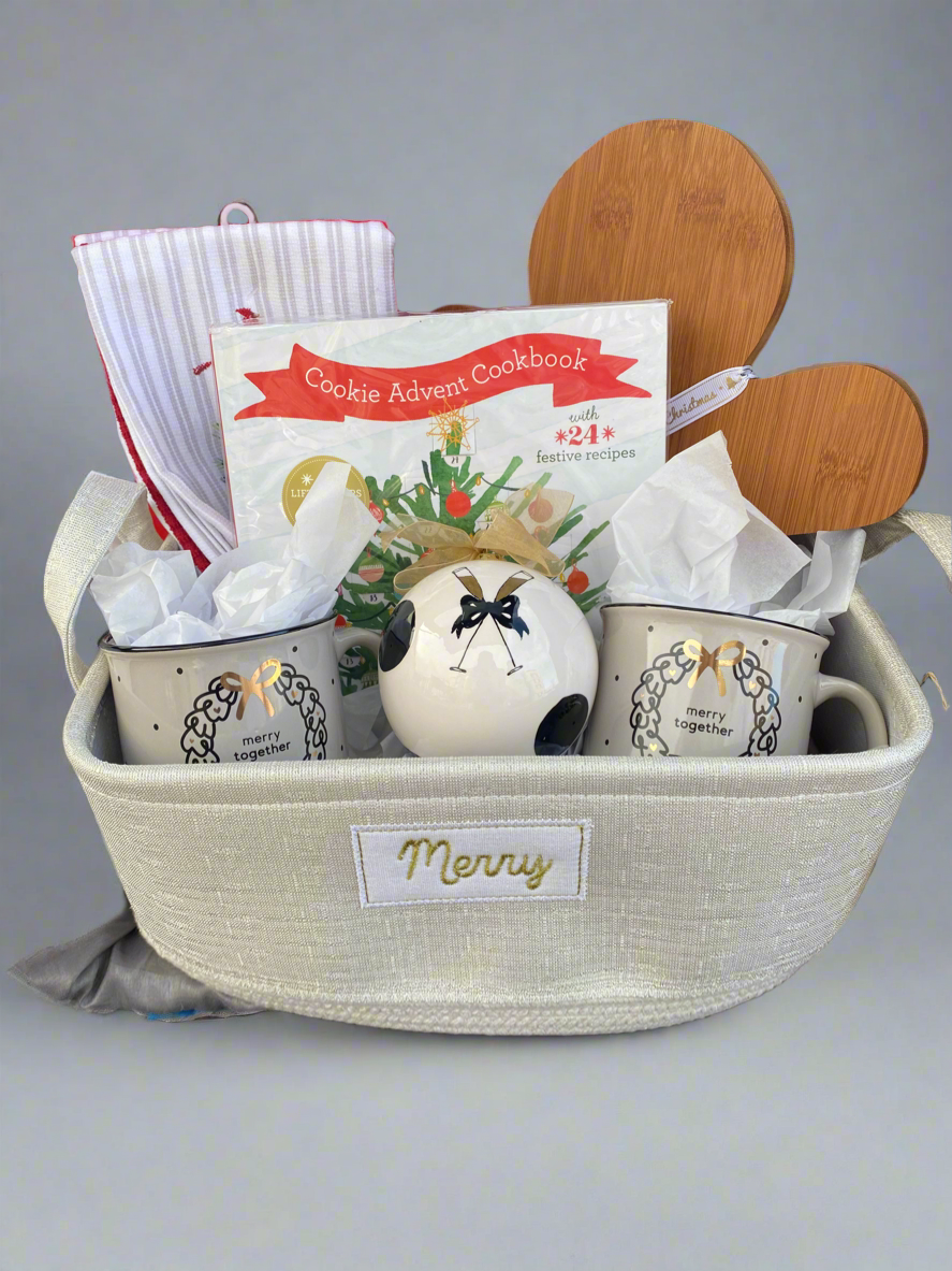 This festive bundle is the perfect way to say congratulations and happy holidays all in one. Inside, they’ll find a keepsake wedding ornament to begin their collection, an advent calendar featuring daily Christmas cookie recipes, a charming gingerbread man-shaped charcuterie/cutting board, cheerful holiday dish towels, and a few extra seasonal surprises to fill their home with joy.
